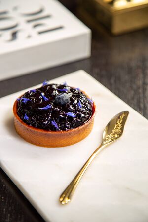 Blueberry tart on a dark background. Blueberry cupcake on black serving board with scattered berries