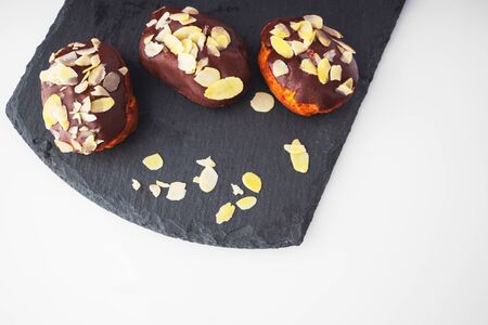 Delicious appetizing brewed cakes. Sweet glazed pastries close-up.