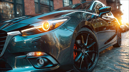 Close-up of the headlights of a modern black sports car in the city.