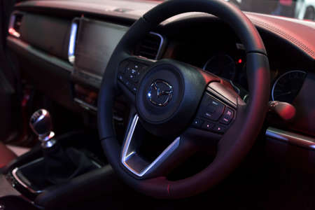 Bangkok, Thailand - March 28,2021 : Mazda car interior with dashboard, steering wheel in Bangkok, Thailand on March 28,2021.