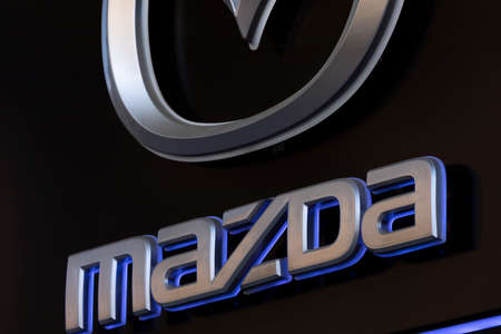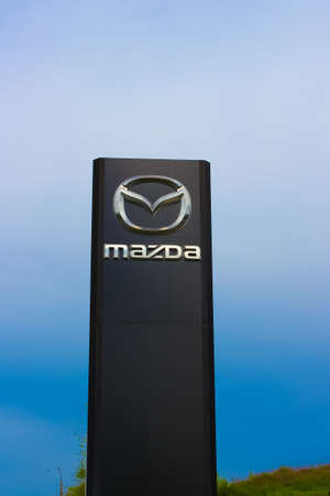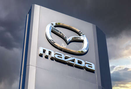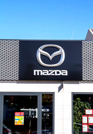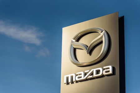 Nuremberg, GERMANY: Mazda dealership sign against blue sky. Mazda is a Japanese automaker and produces over 1 million vehicles per year.