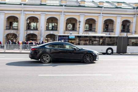 Moscow, Russia - May, 2018: Mazda automobile dealership Sign against blue sky. Mazda is a japanese manufacturer of automobiles and commercial vehicles