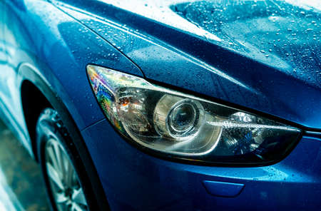 Blue car is washing with water. Auto care business. Car with drops of water after cleaning with high pressure water spray. Car cleaning before waxing service. Vehicle cleaning service with antiseptic.