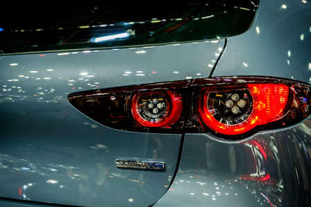 Bangkok, Thailand - December 1, 2019: The tailight of Mazda 3 Fastback Skyactive G showcase at the Thailand International Motor Expo 2019 at Impact Challenger Hall