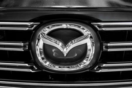 Minsk, Belarus May 2018 brand mazda emblem logo sign on auto during autoexhibition on mazda 6