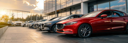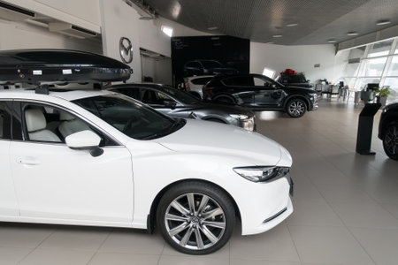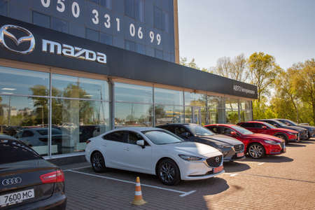 KYIV, UKRAINE - MAY 10, 2021: New Mazda cars on display in front of car dealership Auto International. Cars manufactured in Japan by Mazda Motor Corporation.