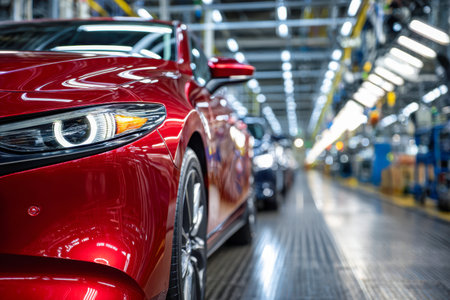 A vibrant red car is guided along an advanced manufacturing conveyor amid sleek machinery and illuminated workspaces, showcasing innovative automotive production.