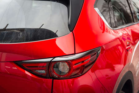 rear view of new modern red sports car led tail lights in showroom