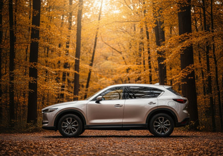 Wellesley Island, New York, U.S.A - October 25, 2019 - A silver Mazda CX-5 SUV surrounded by fall foliage
