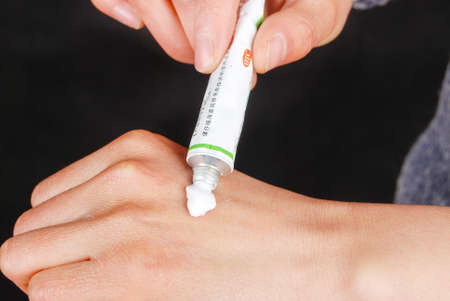 Woman is applying a anesthetic gel on her hand close up.