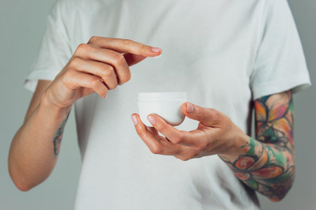 Female tattooed hands holding a jar of cream. Finger with a drop of white cream