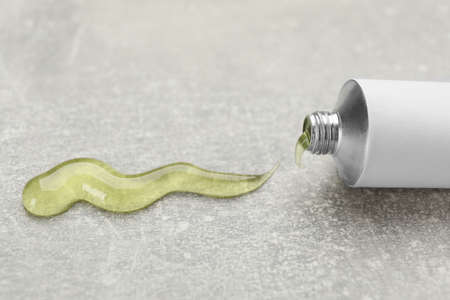 Open white tube with ointment on light gray table, closeup