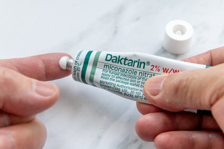 London. UK- January 14.2026. A close up of a person squeezing a tube of Daktarin Cream onto a finger to apply it to treat skin fungal infections. Isolated on a white marble background.