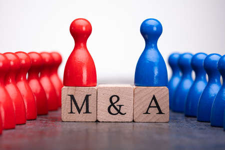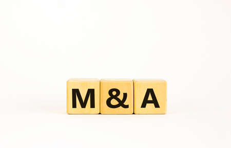 Mergers and acquisitions symbol. Concept words 'M and A - Mergers and acquisitions' on wooden cubes on a beautiful white background. Business, mergers and acquisitions concept. Copy space.