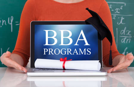 Woman Sitting Against Green Chalkboard With Bba Programs Text On Laptop