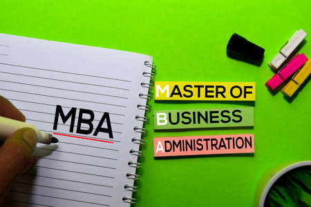 MBA. Master of Business Administration acronym on sticky notes. Office desk background