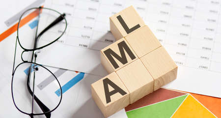 AML words with wooden blocks on chart background. Business concept.
