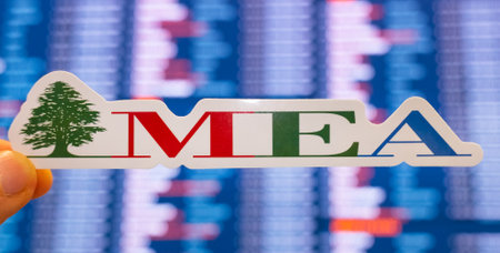 December 11, 2021 Beirut, Lebanon. The emblem of the airline Middle East Airlines against the background of an electronic board with a flight schedule at the international airport.