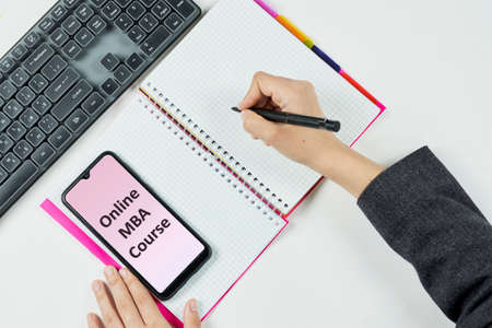 Handwriting text Mba. Master of Business Administration on spiral notebook table with male hand. education concept