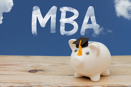 Getting your MBA, A white piggy bank with grad cap on weathered wood with sky background with text MBA