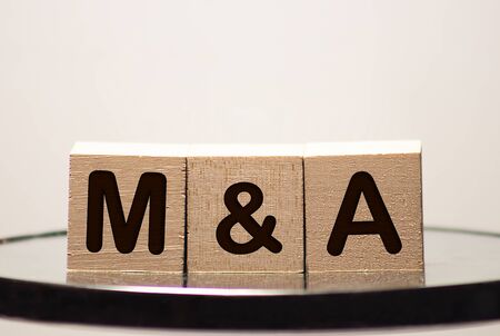 M&A (Mergers and Acquisitions) word written on wooden blocks. The text is written in black letters and is reflected in the mirror surface of the table. Business concept for your design.
