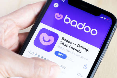 Coffee meets bagel logo on the screen of mobile phone in mans hand. Application for dating and acquaintance. Man is laying on the sofa and looking for partner in the internet. Online dating.