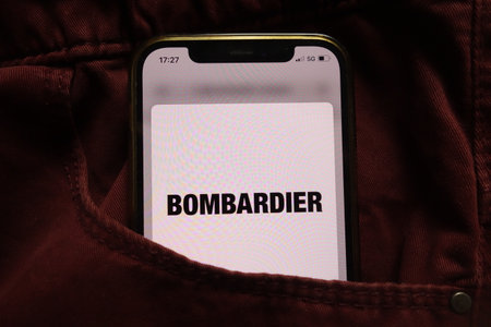 KONSKIE, POLAND - September 15, 2021: Bombardier Inc displayed on mobile phone hidden in jeans pocket