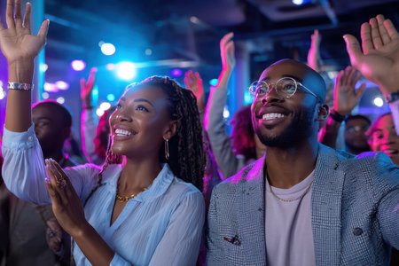 Friends cheer joyfully together at a lively concert, surrounded by colorful lights and energetic crowd.