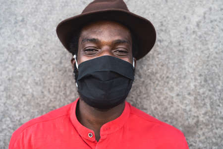 Portrait African man with dreadlocks in black t-shirt standing near city wall