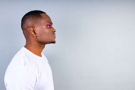 afro american man in white t-shirt casual style with pink eyeshadow and lipstick crossdressing in fashion show studio background