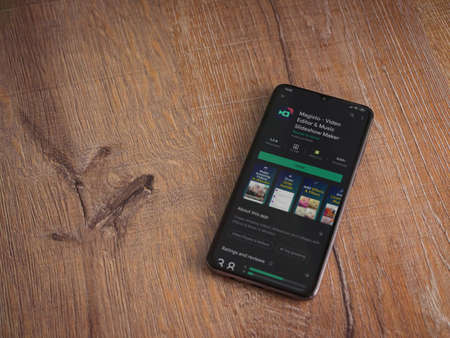 Lod, Israel - July 8, 2020: Magisto - Video Editor and Movie Maker app play store page on the display of a black mobile smartphone on wooden background. Top view flat lay with copy space.