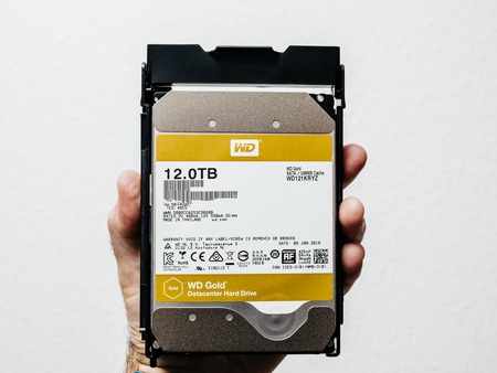 PARIS, FRANCE - FEB 15, 2018: Man holdinng New Western Digital Gold HDD enterprise level 12 terabytes disk drive