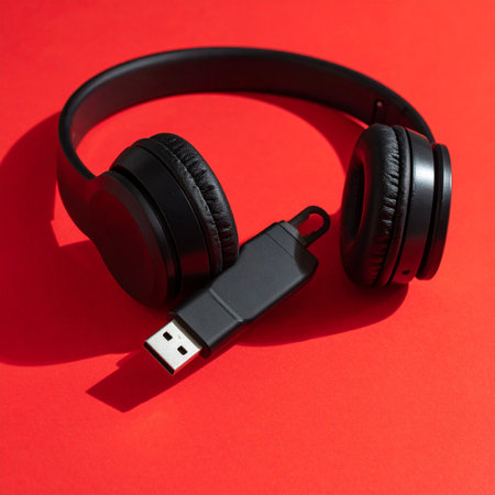 A modern, glossy black storage gadget with a shiny metal plug rests on a mirrored surface, illuminated by gentle, colorful sparkles capturing a celebratory mood.