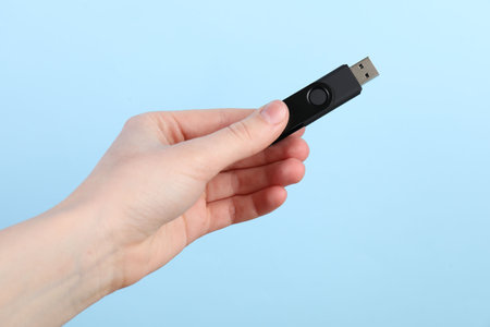 Woman holding USB flash drive on light blue background, closeup