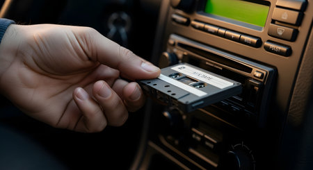 A close-up of a man's hand inserting a vintage cassette tape, labeled 'MIX TAPE,' into the dashboard stereo player of a car. The image evokes nostalgia, retro technology, and music on the road.