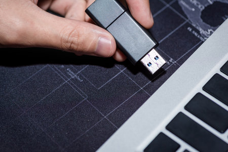 Close-up of man's hand holding USB flash drive in front of laptop