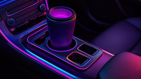 A striking close-up of a car interior featuring a coffee cup in a console, illuminated by vibrant purple and blue neon lights, creating a cozy and modern ambiance.