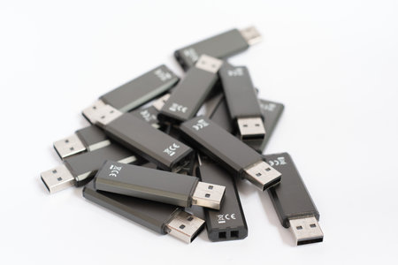 Selective focus shot of a pile of black USB flash drive stick with white background.