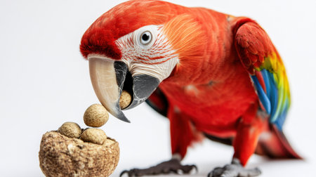A stunning close-up of a vibrant scarlet macaw engaging in a feeding activity, showcasing its lovely colors and unique personality against a soft white backdrop.