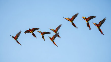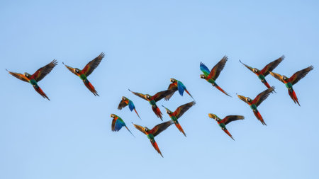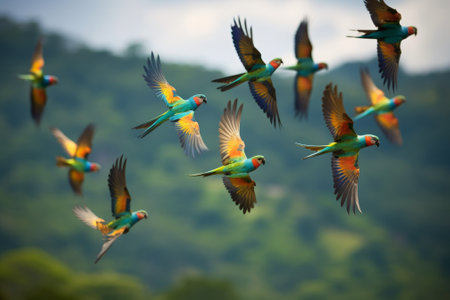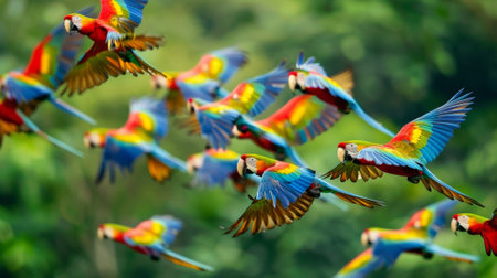 A group of rainbowcolored parrots flying in unison over a lush tropical forest their migration marked by loud chirping and vibrant plumage
