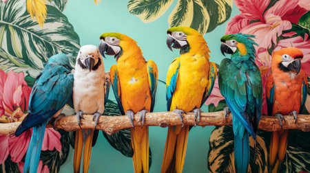 A vibrant lineup of colorful parrots perched together against a tropical background, showcasing exotic birds in bright colors.
