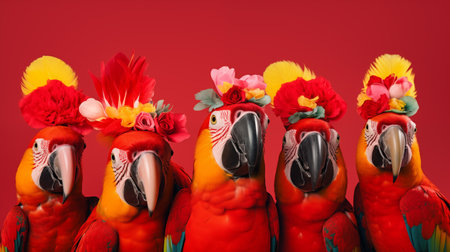 Flock of parrots in vibrant ruffled collars and hats, on a bright red background, suitable for a cheerful birthday invitation, with copy space and advert lighting
