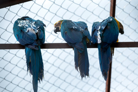 Tropical birds, Macaw bird is jumping on the cage with a black background - Image.