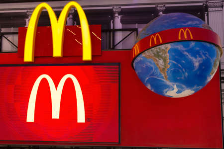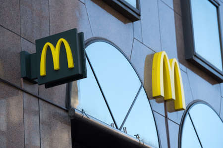 Moscow, Russia - September 22, 2017: Fast food restaurant McDonalds logo on the wall