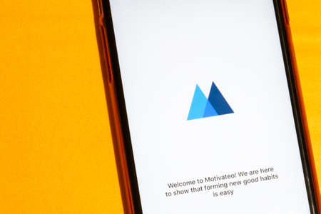Los Angeles, California, USA - 22 January 2020: Motivateo logo on phone screen flat lay with orange background, Illustrative Editorial.
