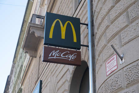 Budapest, Hungary - 1 November 2021: McCafe McDonalds cafe logo on street, Illustrative Editorial.