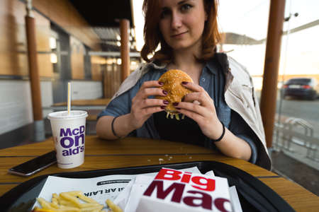 KALININGRAD, RUSSIA - OCTOBER 13, 2018: young woman drinks Coca-Cola at McDonald's restaurant.