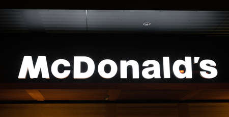 McDonalds restauraunt sign on the black background. McDonalds sell fast food such as hamburgers, french fries and drinks. A famous fast food restaurant in the world.