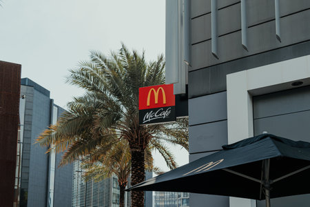 Dubai, UAE - February 12, 2020: McDonald's outlet on Dubai City Walk with palm trees and modern architecture