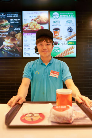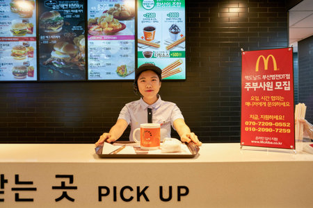 BUSAN, SOUTH KOREA - CIRCA MAY, 2017: worker at McDonald's. McDonald's is an American hamburger and fast food restaurant chain.